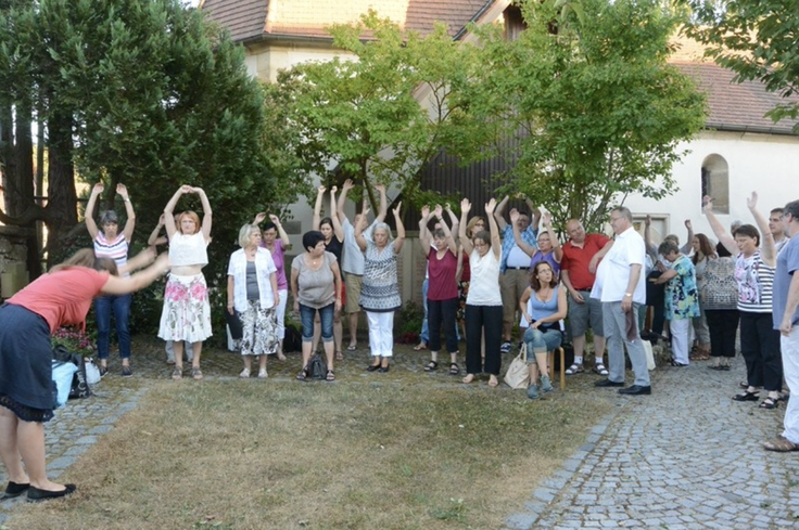 Hauptprobe für das Konzert für die Hospizgruppe:  Erst die Aufwärmgymnastik im Freien...